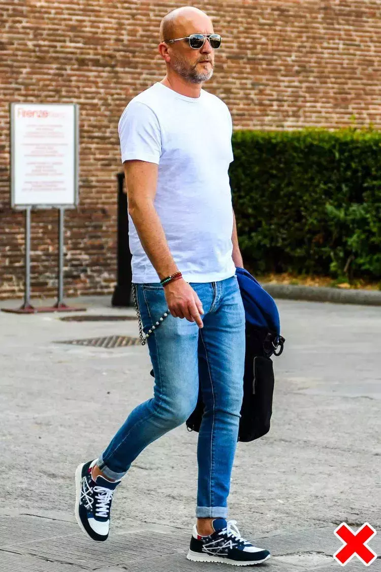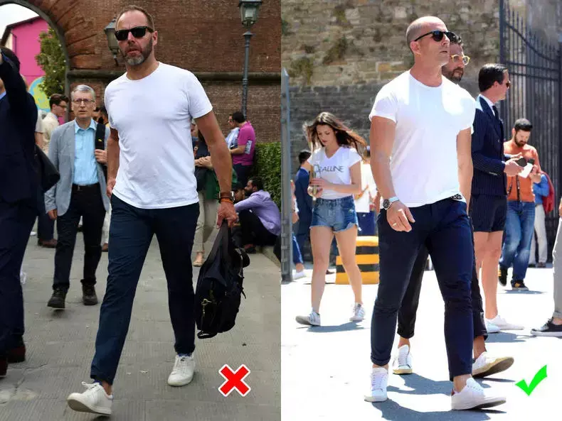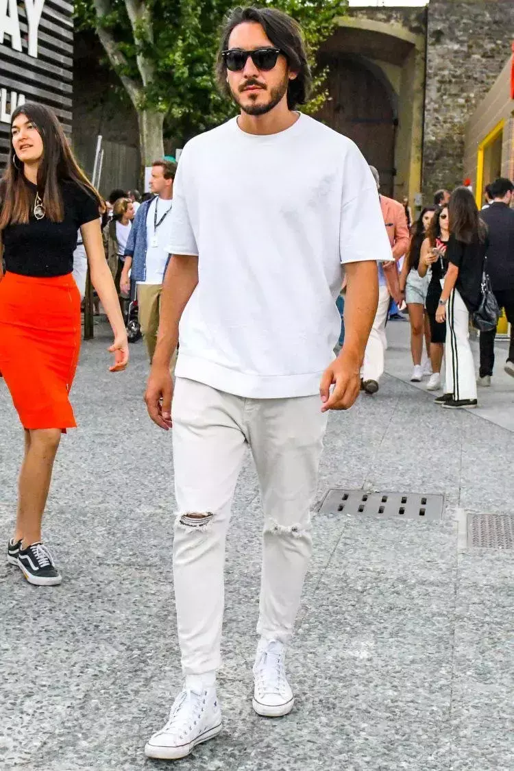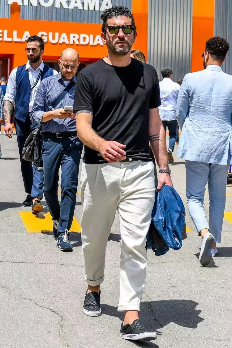 So, if you are a fat man, don’t bother with a white T-shirt. Just wear a black T-shirt. At least you won’t be exposed. Fat on the upper body. If you use the classic black and white color scheme, pair a black T-shirt with white casual pants and a pair of black loafers to still look refreshing.
