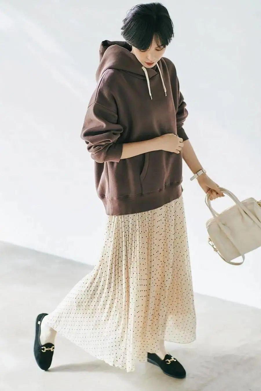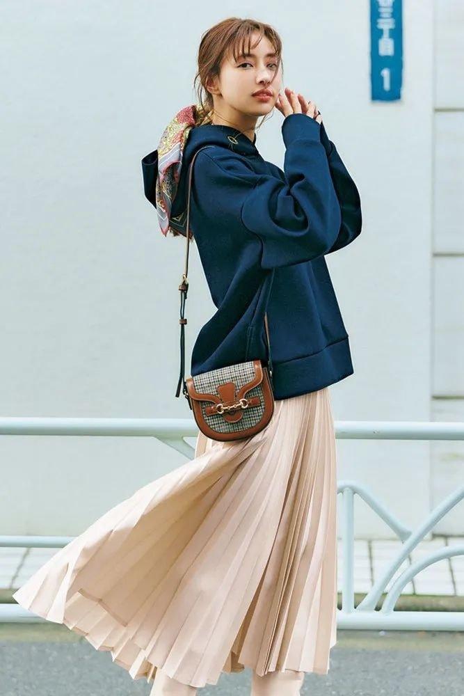 In addition to the fashionable layering For inner wear, you can also focus on the bottoms. For example, when matching a sweatshirt and a skirt, adding lines makes the whole outfit more three-dimensional. If it is a skirt with a pleated design such as a pleated skirt, be careful not to let the pleats form pleats, otherwise the line will be lost, and the delicate pleats will make you look slimmer.