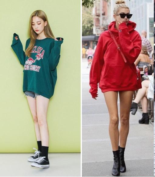 The method of missing the lower body is also a recent one. One of the most popular ways to wear a sweatshirt this year.