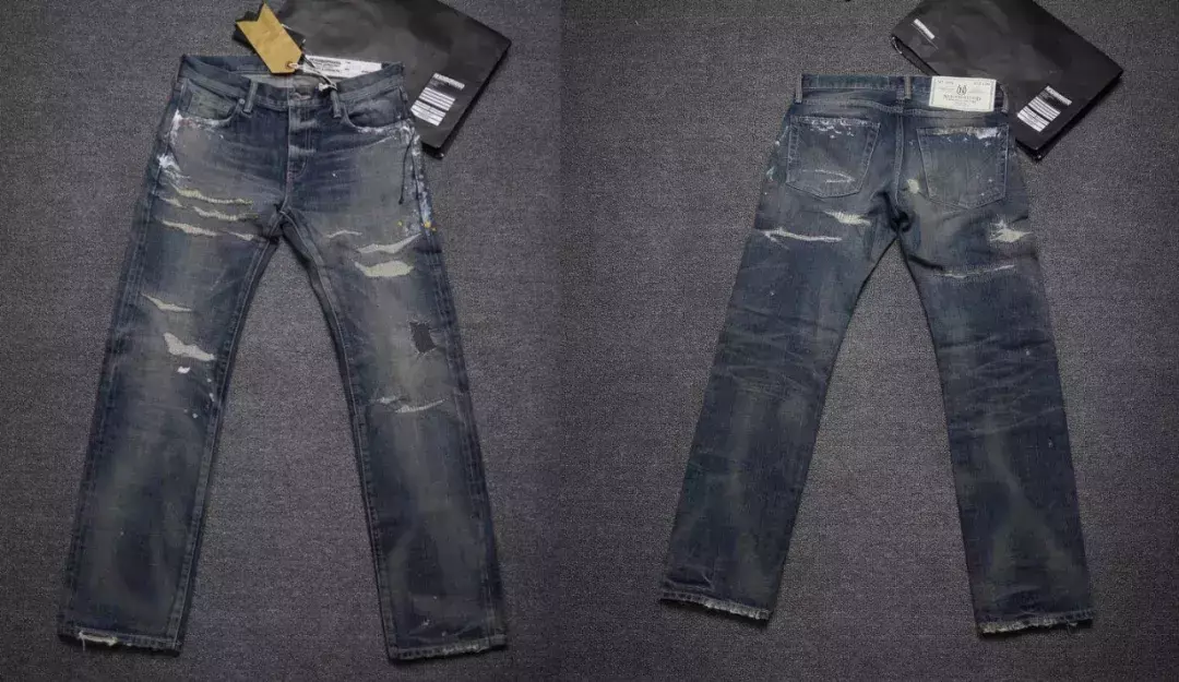 Due to the limitations of the specifications of old-fashioned looms, the total length of raw oxen before desizing and shrinking is generally 116CM-125CM. In addition, the pants themselves are completely covered with slurry, and the version is very exaggerated and shocking. Denim that has undergone desizing treatment cannot feel its own cotton texture at all. More importantly, only after desizing and shrinking treatment can the true shape of pants be revealed.