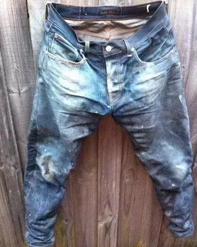 After several hours of professional work by Nudie Jeans’ repair experts, these jeans were perfectly repaired and were officially purchased and sealed by Nudie Jeans. The official washing designer based on the pants sample, Design the most perfect and most similar replicas and sell them in bulk. (Real case)