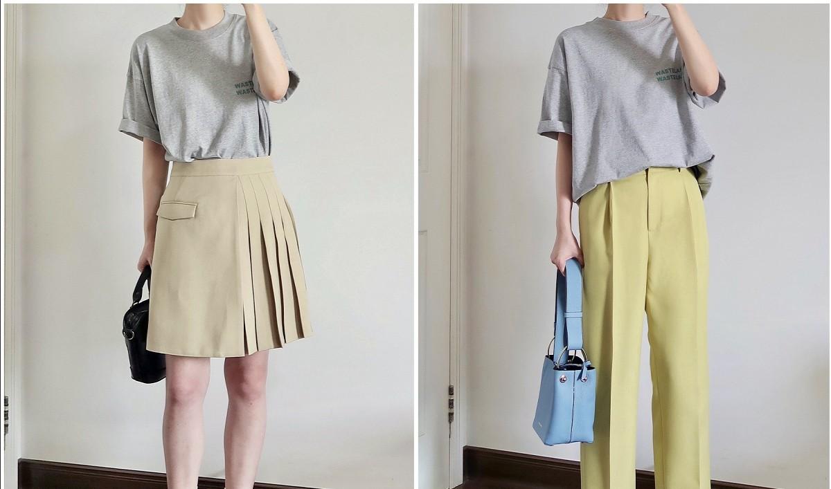Those women who are tired of matching basic colors can choose bright-colored bottoms and light gray T-shirts. Even if this kind of clothing has bright spots in appearance and structure and is particularly bright in color, it will not look yellowish. Choose a light yellow skirt or loose yellow trousers to match with a light gray T-shirt, which will be more fashionable.