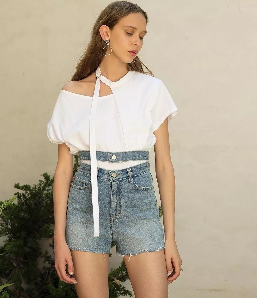 Pairing guide: Wear a short-sleeved T-shirt with an off-shoulder fake collar style on the upper body. Again, the loose style should be the main one. Wear a pair of denim shorts with whisker edges on the lower body. The colors of the two can be a “dark + light” color combination, or a similar color combination.
