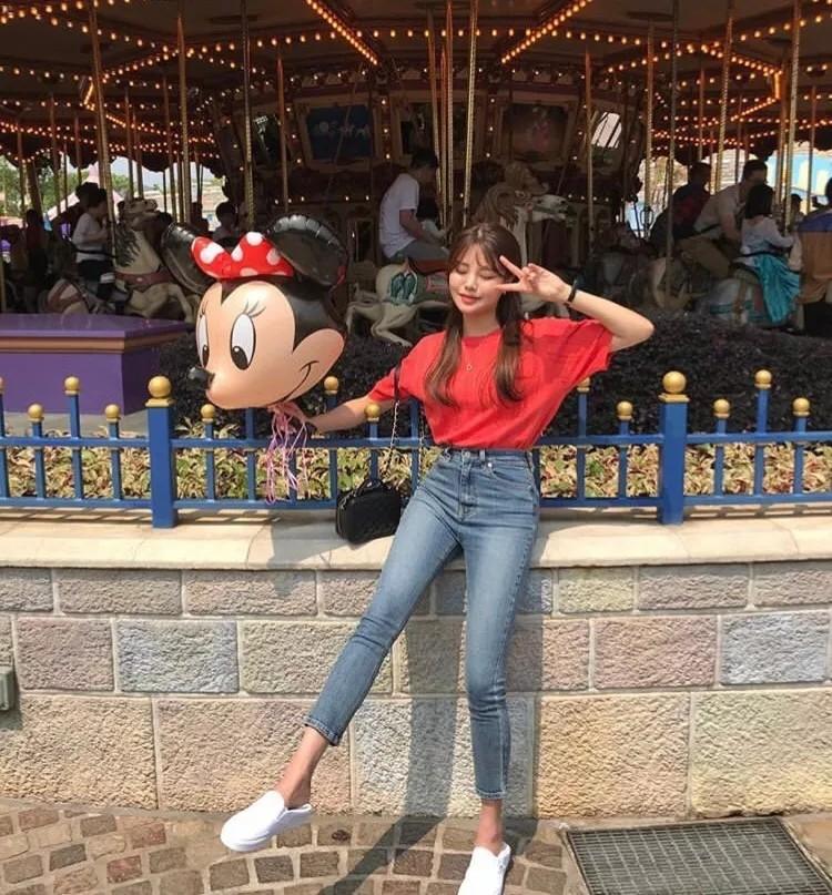 Tight jeans have a very good feature, that is, they can perfectly outline a girl’s graceful body curves, and they match with tight jeans. In addition to loose styles, short-sleeved T-shirts can also be slim-fitting. Of course, a slim-fitting short-sleeved T-shirt with a navel-baring style is perfect.