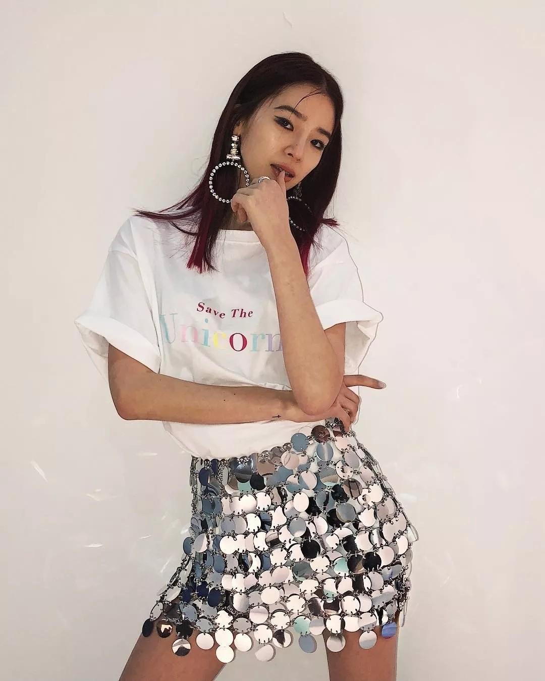 Pairing guide: Wear a short-sleeved T-shirt on the upper body. Try to choose a loose-fitting T-shirt with letter printing, and match a round sequin embroidery on the lower body. Of course, you can make short skirts. This kind of short skirt is very visual and very fashionable.