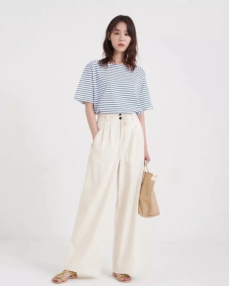 Pairing guide: If it is a delicate girl, we can wear a striped mid-length short-sleeved T-shirt on the upper body, and Pair the lower body with a pair of khaki casual pants, and put the short-sleeved T-shirt into the casual pants.