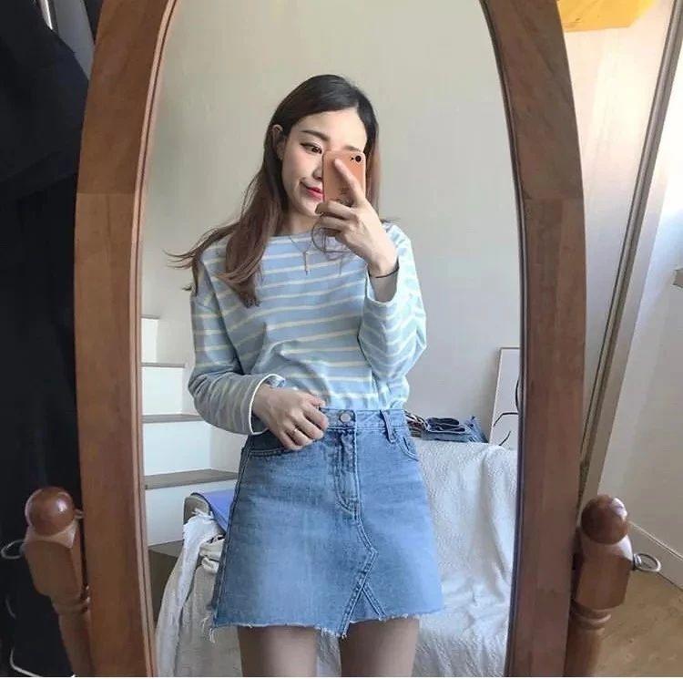Compared with the skirt, the short denim hip skirt can bring out the If you have slender legs and want to show a more pure side, you need to wear a top with a fresh color on your upper body. The light blue-green striped top chosen by the young lady in the photo is particularly perfect.