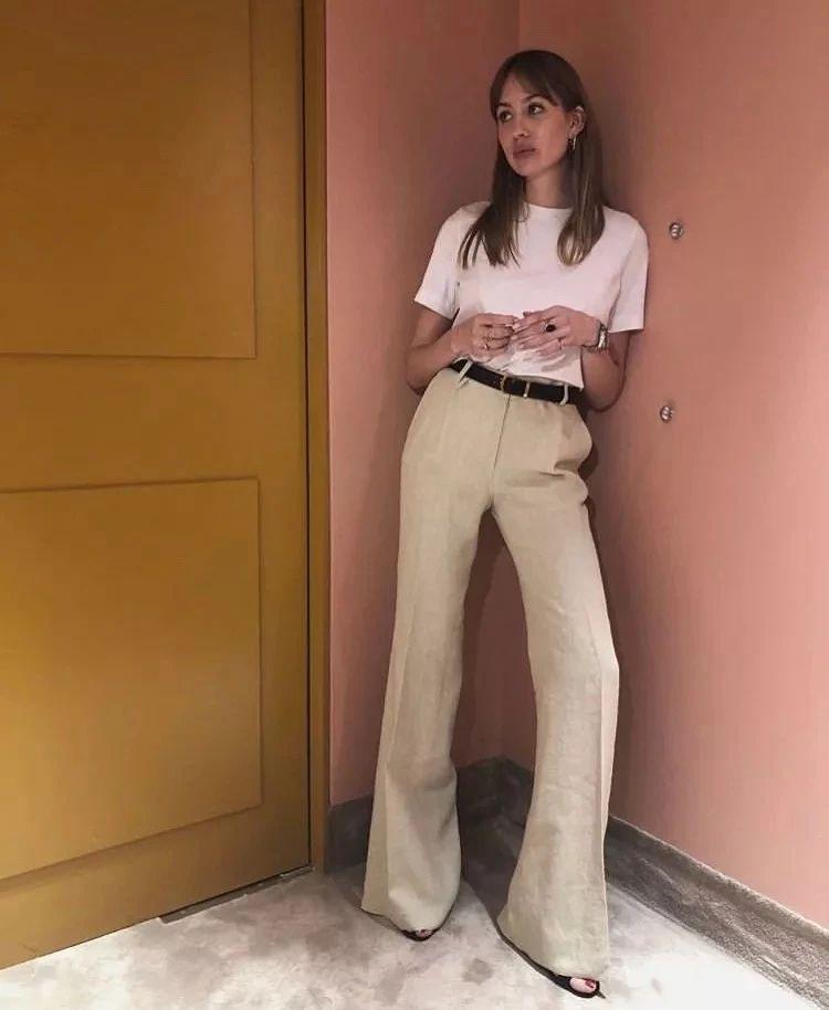 Generally speaking, if the wide-leg flared pants are matched perfectly, they will give a light modern girl feel. In the photo This young lady wears a short-sleeved slim T-shirt on her upper body and a pair of khaki wide-leg bell-bottom pants, giving her a modern temperament.
