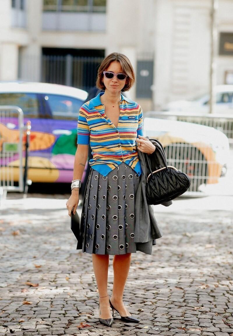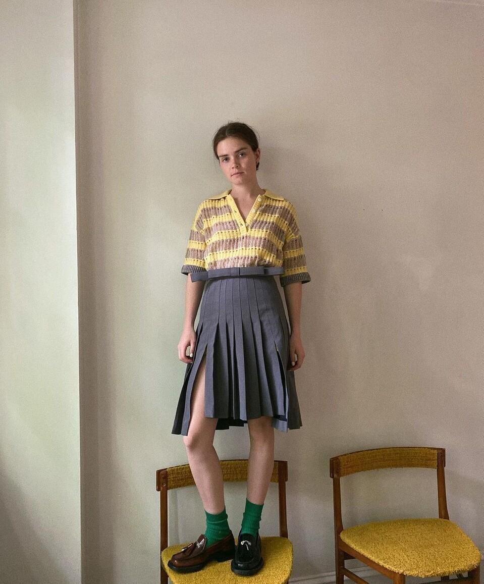 It is recommended to choose a gray slit design for the pleated skirt, and a yellow striped polo shirt for the upper body. The overall shape is very refreshing and soft, and paired with a pair of small leather shoes to create a retro feel.