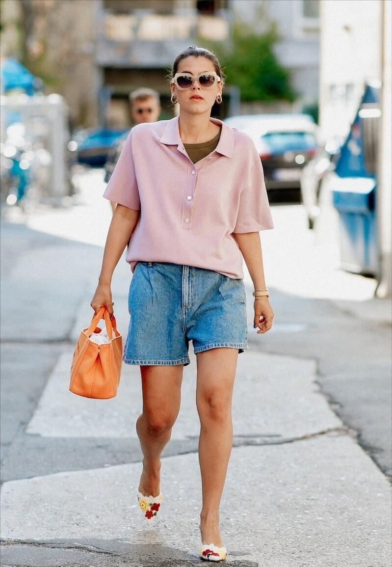 Light blue denim shorts are suitable for matching with light-colored polo shirts, so you might as well use a light pink polo shirt to match yourself. The combination of pink and blue will create a very fresh and refreshing state. .