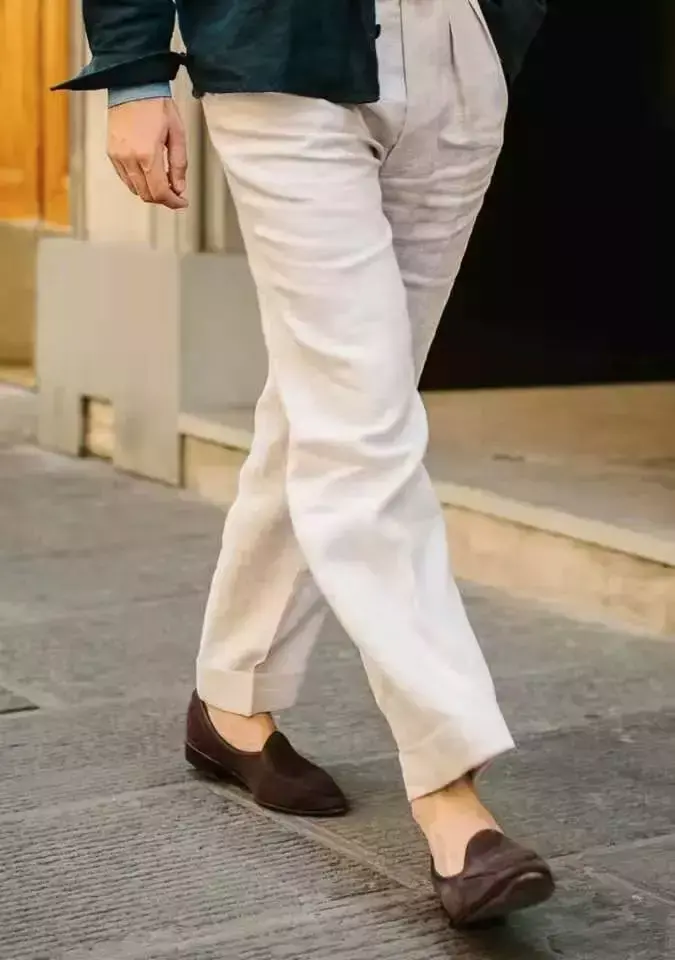 For cotton and linen pants, be sure to control the length of the pants. As long as the trousers are not too tight, they are fine. The trousers length is highly recommended to be 9.5 points, which means they are closely adjacent to the shoe upper but do not invade each other.