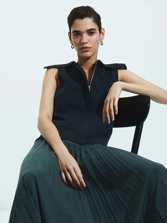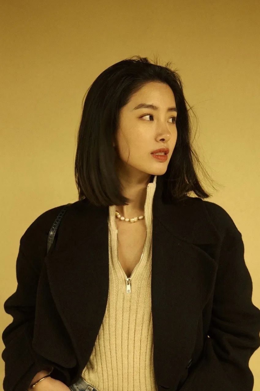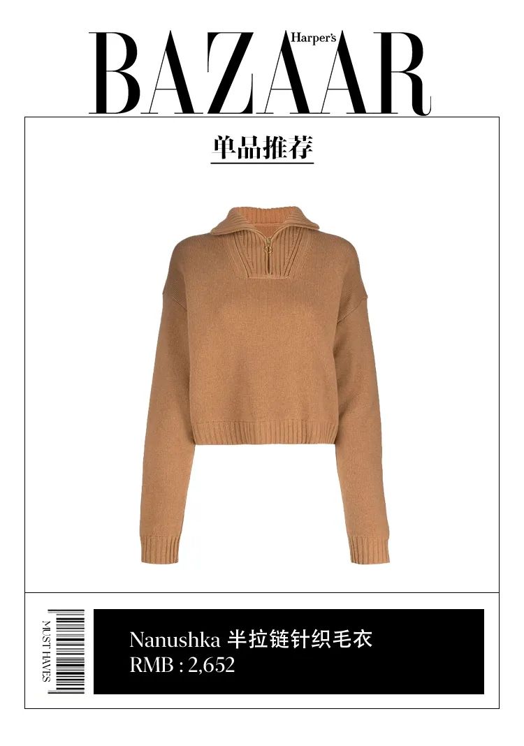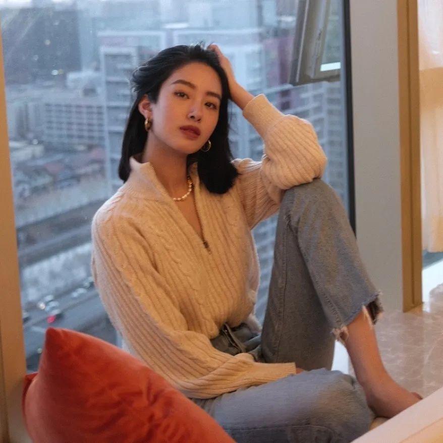 The half-turtle collar zippered Polo shirt worn by Yang Caiyu is versatile for everyday use and is a practical choice. The zipper design makes the turtleneck sweater breathable, and the ribbed stiff material makes the stand-up collar stylish but not too exaggerated. .At this time, the empty neck needs a necklace to make the sweater more refined.
