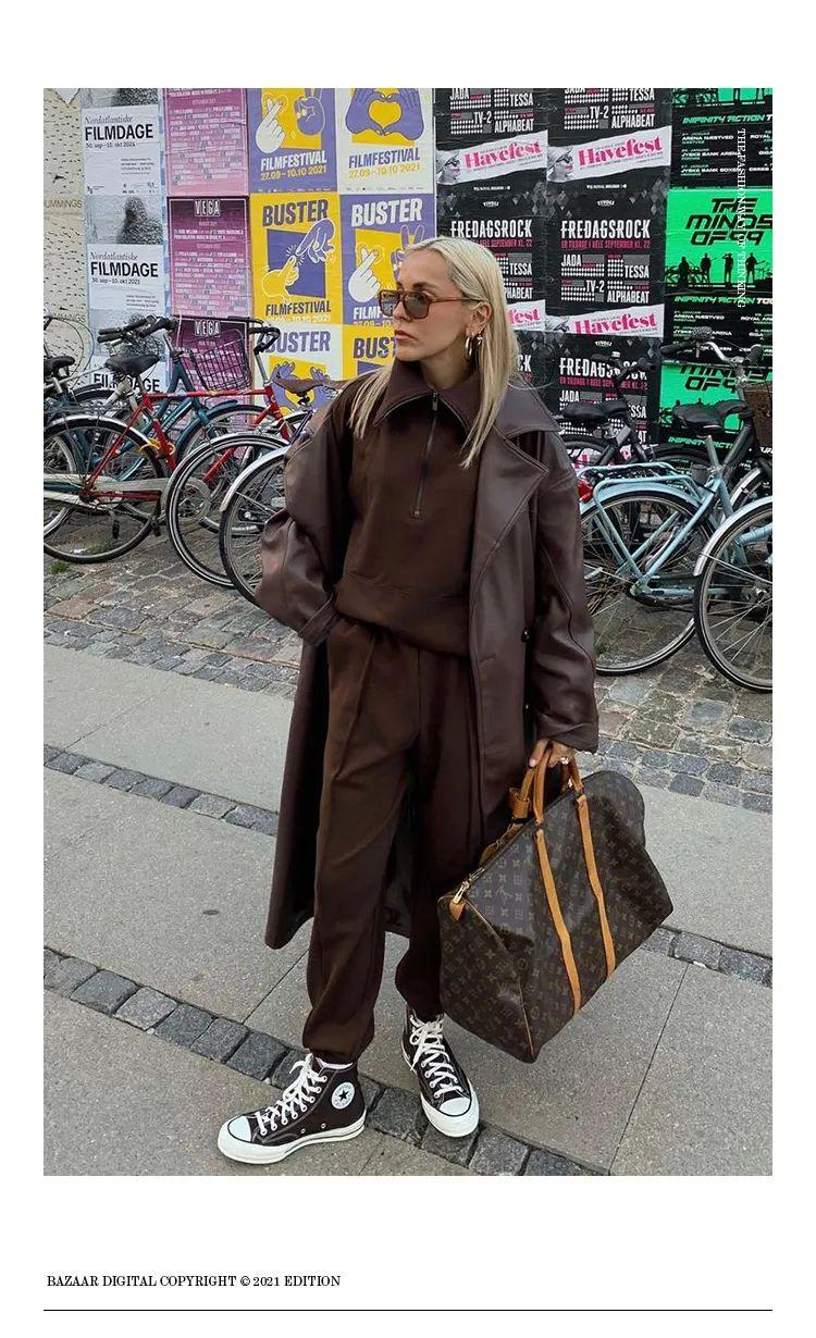 The Athleisure trend brought about by sweatshirts and sweatpants is still popular this autumn and winter. A formal coat paired with a sweatshirt and sweatpants is the essence of Athleisure style. The suit feeling created by similar colors is a high-end combination of Athleisure style.