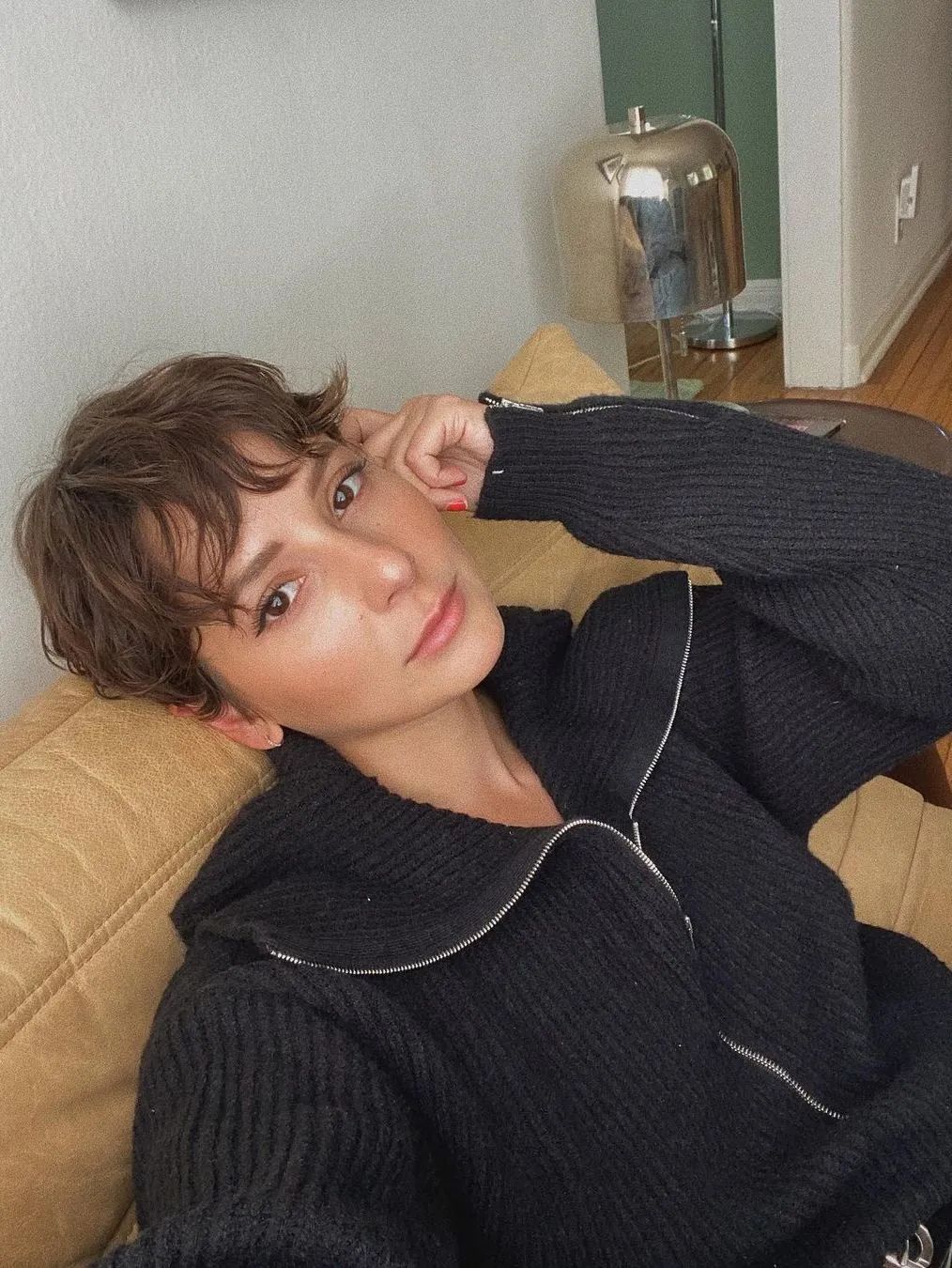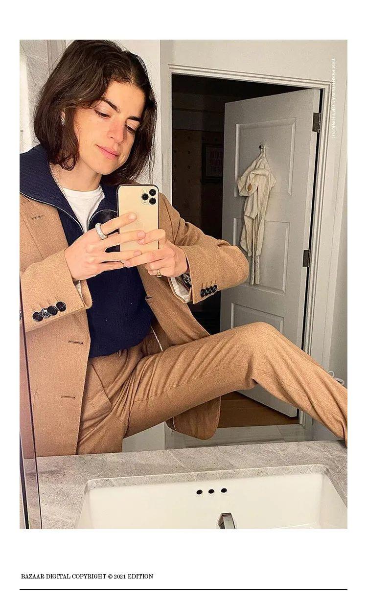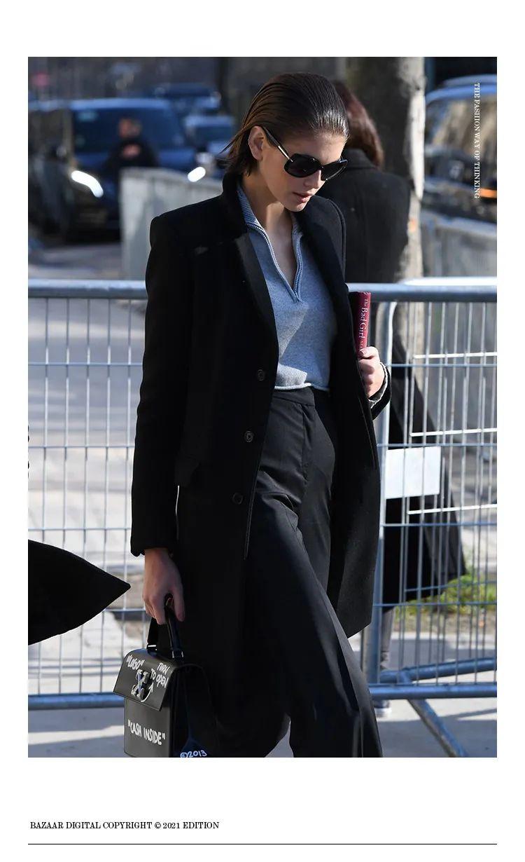 Kaia’s suit pants and formal coat are originally a very formal match, but using only a short Polo collar sweater as an inner layer immediately alleviates the problem. It has a sense of seriousness, is refreshing and clean, and is a match suitable for Kaia’s age.