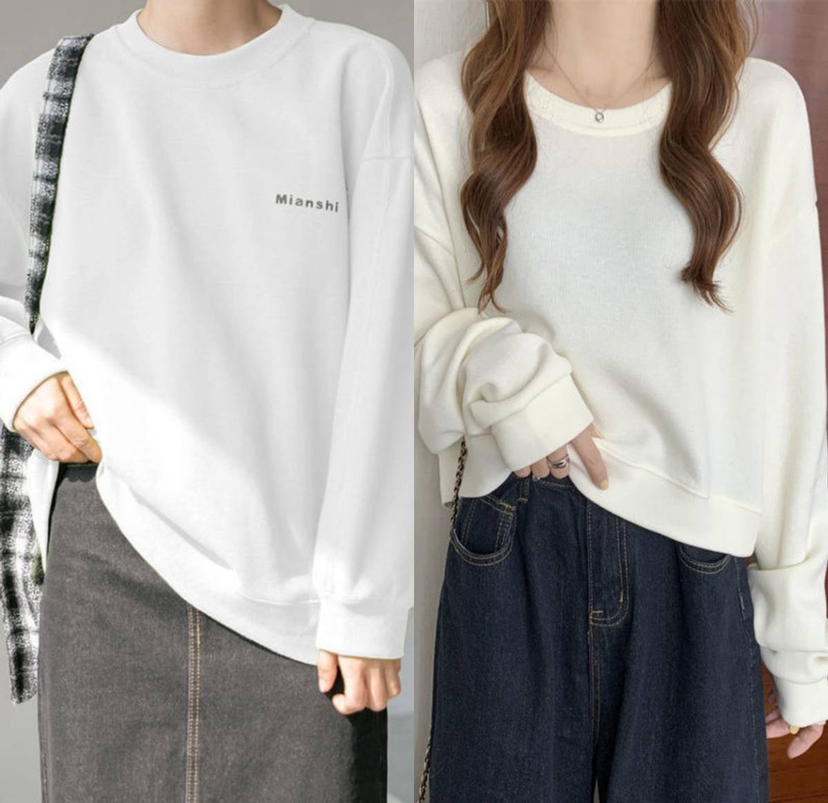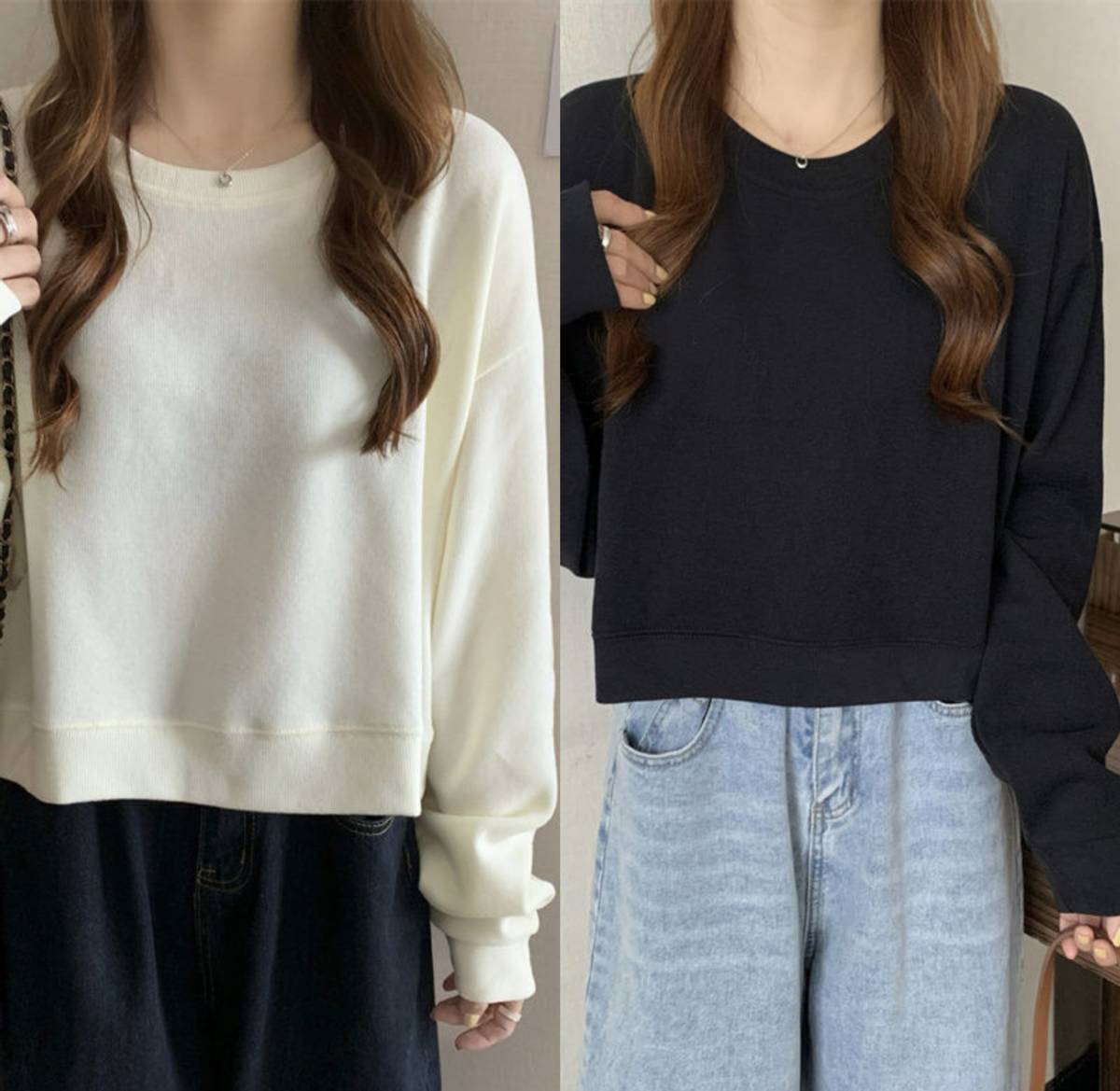 A shorter white round-neck sweatshirt can not only enhance the fresh feeling, but also show off the curves, especially the outline of the waist line, thus tightening the Long leg silhouette. The most common black sweatshirt can take advantage of the color to narrow the figure and make it appear slimmer.