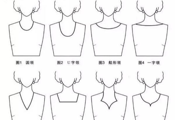 The most common classification of collars can be divided into these 8 categories, as shown in the figure . Figures 1-8 are round collar, U-shaped collar, boat collar, one-word collar, V-neck, square collar, pentagonal collar and sweetheart collar respectively.