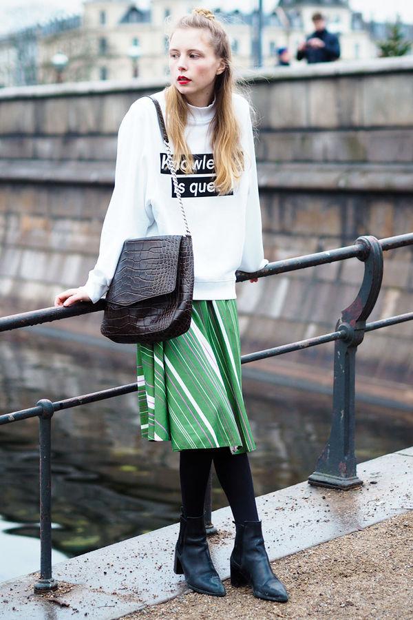 There is another special style in the round neck sweatshirt style, which is the half turtleneck sweatshirt. It is also a type of round-neck sweatshirt. Its special feature is that the neckline is longer than that of ordinary sweatshirts, making it warmer and showing a slender neck. To a great extent, it has improved the shortcomings of “air leakage” at the neckline of ordinary round-neck sweaters. The half-turtleneck sweatshirt paired with a skirt is also very fashionable. It has a gentle and elegant feeling, which is perfect for spring!