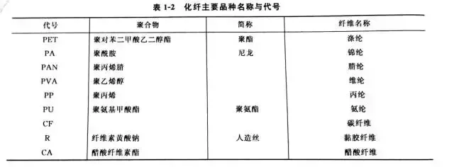 The main varieties of chemical fibers generally have common names and codes, and their fiber-forming polymers usually also have abbreviations. The names and codes of the main varieties of chemical fibers are shown in Table 1 -2.