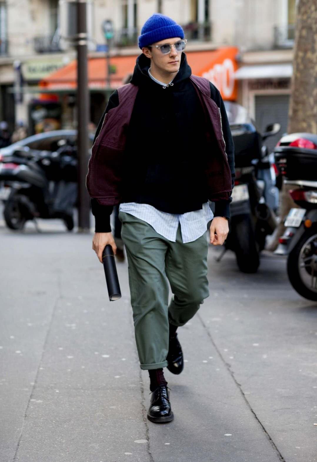 Wear three layers, a shirt, a sweatshirt and a vest. The lengths are orderly, and the color matching is also moderate. It is neither bloated nor sloppy, but also very stylish. Cool and capable, paired with a melon cap and desert boots, this look is sure to turn heads.