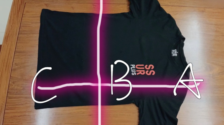 1. Find the center horizontal line of the T-shirt and the vertical line at the shoulder