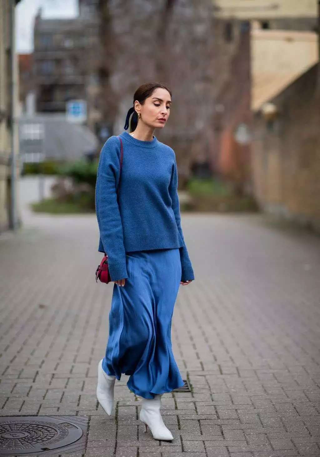 If you don’t like the exaggeration and sexiness of satin suspender skirts, add a warm one in this season when the weather gets cooler. A pullover sweater is also a good choice. Satin skirts are more shiny than ordinary skirts, so they will look very high-end when paired with them. However, due to the softness and drape of satin skirts, satin skirts that are too short will look strange. The best length is generally below the calf, which can better show the drape of satin. And this length is also very friendly to girls with thick legs.