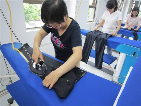 First turn the trousers over and iron the inner trouser pockets straight; then put the trousers back to the front and check the surface of the trouser legs. Iron the inside to the outside, then iron the bottom of the leg.