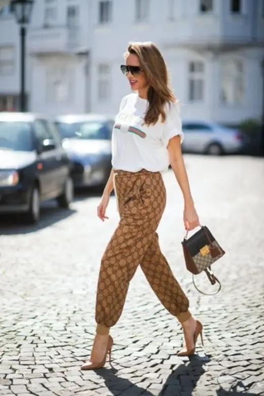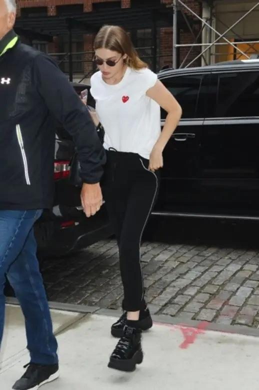 You can also tuck a corner of a loose-fitting T-shirt into your pants to modify the fat on your waist. Of course, the model Gigi Hadid has zero fat, but uses pleats to create a casual and handsome look.