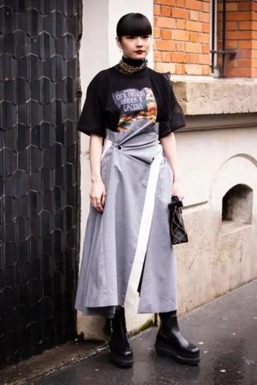 If you want to greatly enhance the trendy style of wearing a T-shirt, Japanese trendy model Akimoto Suo starts with a slightly more fancy T-shirt style and pairs it with a pleated wrap skirt that is also full of details. Heavy footwear balances the focus of the entire body.