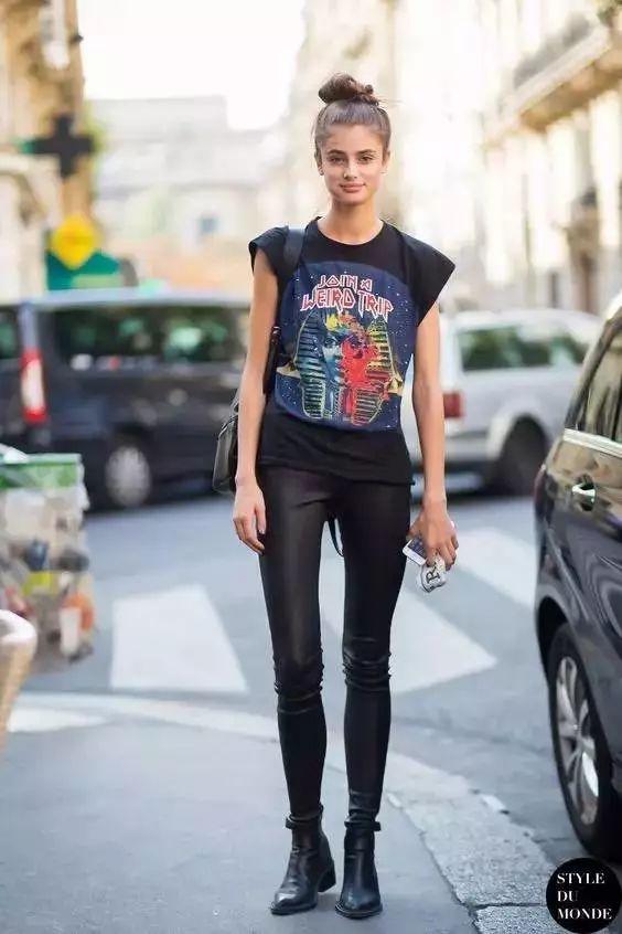 A handsome retro band T-shirt and tight-fitting black leather pants create an instant look Two-meter legs.