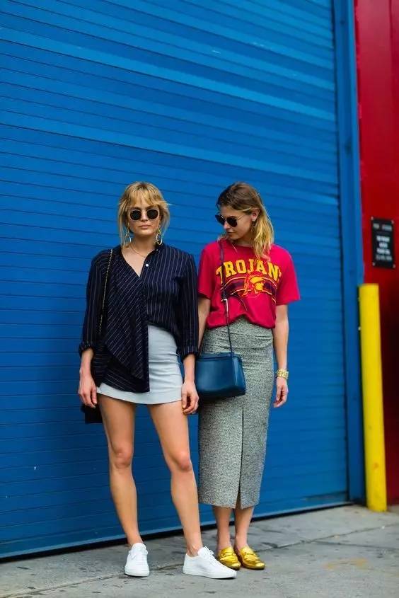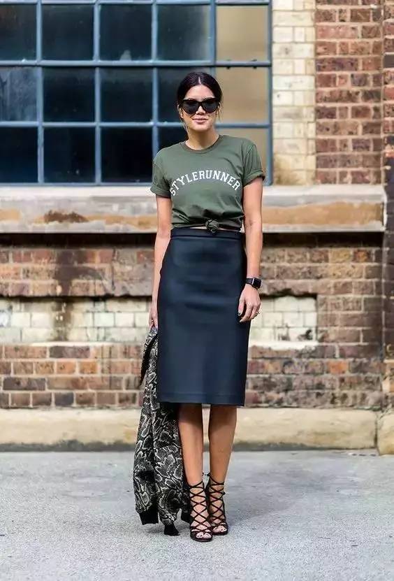 The slit skirt has a natural advantage. It can reveal long legs in a slight breeze. Pair it with a retro sologan T-shirt for a full street feel. .
