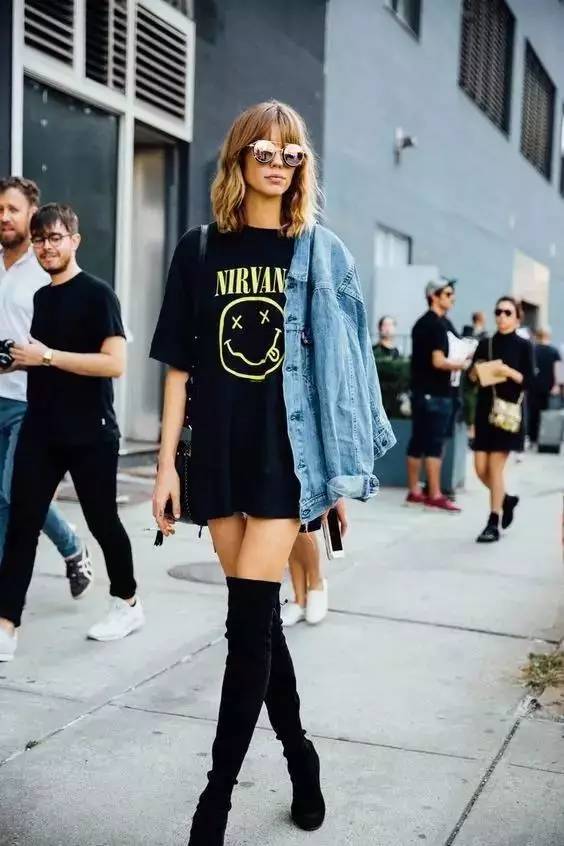 The large oversized T-shirt and tight-leg over-the-knee boots are very sexy. If you have a big temperature difference between morning and evening, you might as well give it a try.