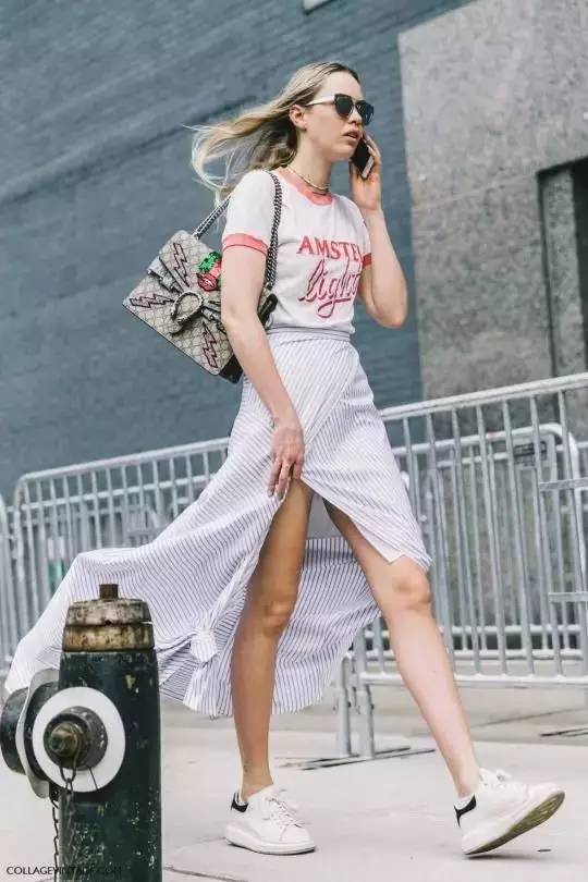 Slit skirt has a natural advantage. It can reveal long legs if the wind blows slightly. Paired with a retro sologan T-shirt, it has a full street feel.
