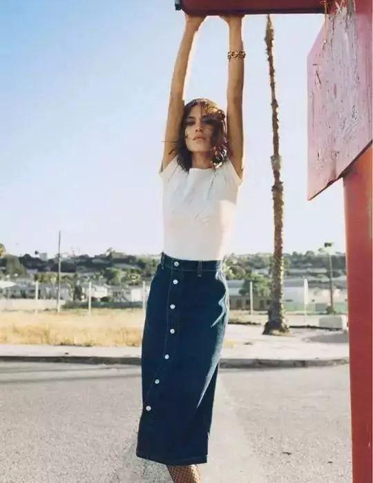 The buttoned denim skirt that was very popular last year is still popular this year. Miss Zhong can easily create a French style by pairing it with a white T-shirt Romantic style.