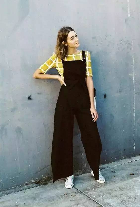 Originally overalls are a girly item, but wide-leg overalls skirts are Less childish and more willful. Black wide-leg overalls paired with a yellow plaid top make it look a lot less boring.