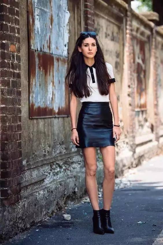 A black and white color-blocked Polo shirt paired with a black short leather skirt is smart and neat.