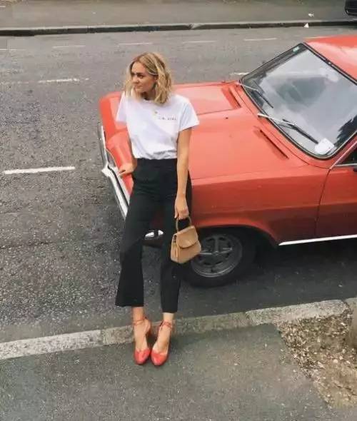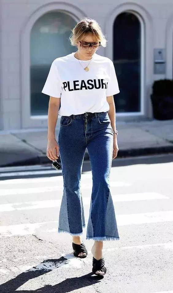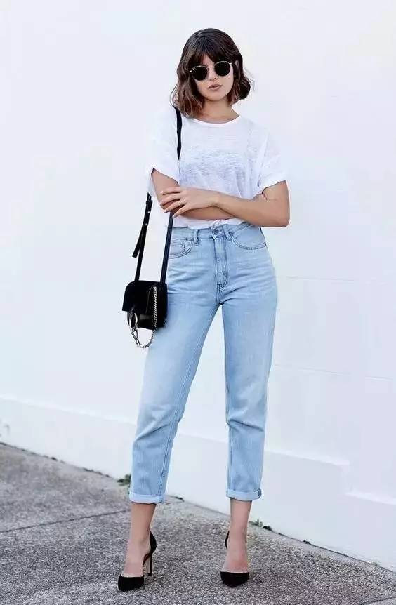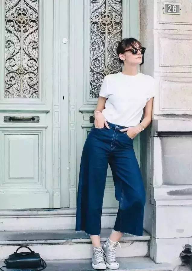 Needless to say, the practicality of this classic combination of T-shirt and jeans has never changed. In summer, you must expose your ankles to make them appear more breathable and slender. Add a pair of designer sunglasses and red lips, and you can look fashionable even with a simple combination.