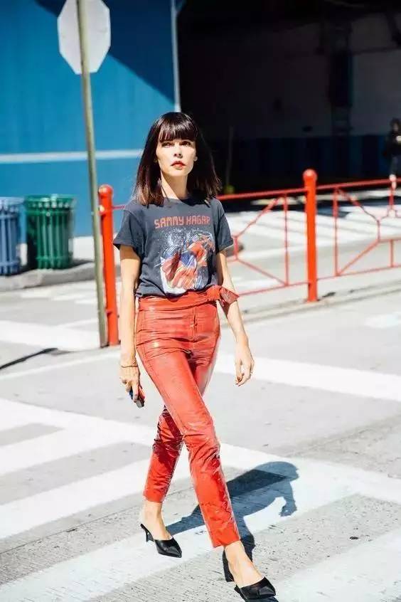 The flamboyant red patent leather pants and handsome retro band T-shirt are suitable for walking Trendy people who are on the ordinary road, wear this combination with a 100% chance of turning heads.