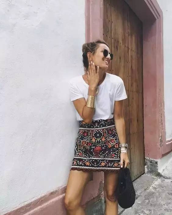 A short slit skirt paired with a printed T-shirt reveals long legs while walking . Casual yet feminine.