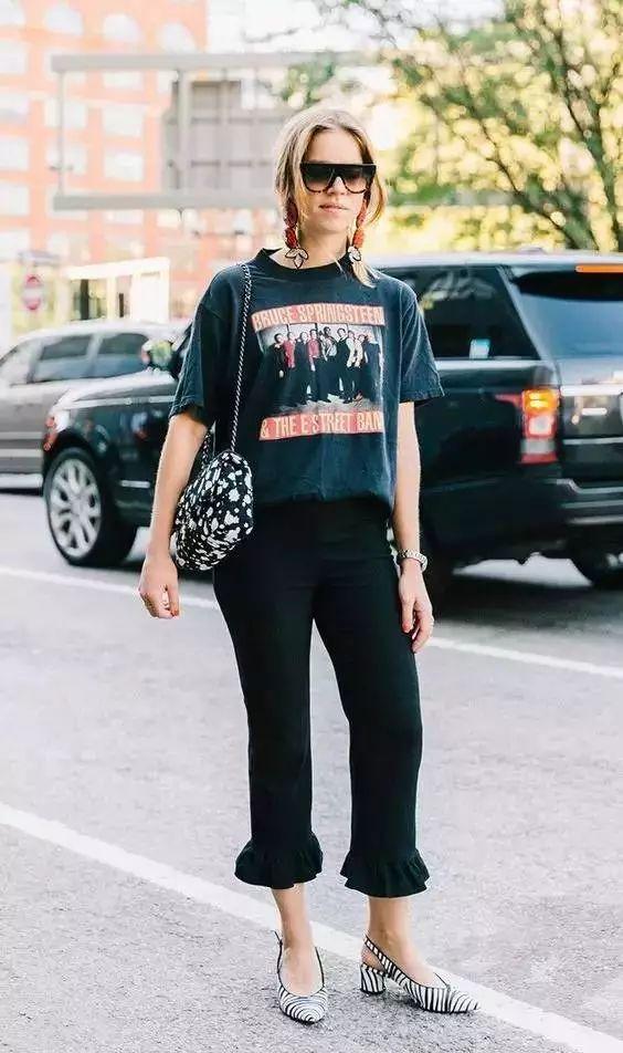 A pair of plain leggings immediately became more sophisticated after adding ruffles. Come alive. The decorations on the bag and shoes echo perfectly, and the color of the earrings also matches the T-shirt. Although it is a focused set, it does not look cluttered at all.