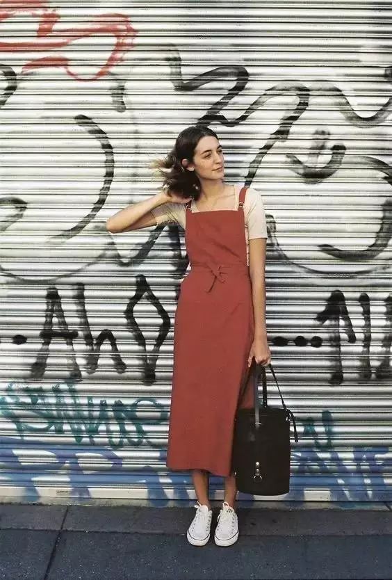 The clay brown suspender skirt looks elegant and elegant, paired with a T-shirt and suspender skirt of the same color Canvas shoes are suitable for girls with an artistic flair.