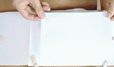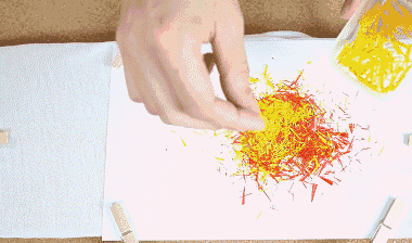 Then place the hollowed-out paper on the prepared clothes, secure it completely with clips, and then sprinkle the scraps of crayon on the hollowed-out position.