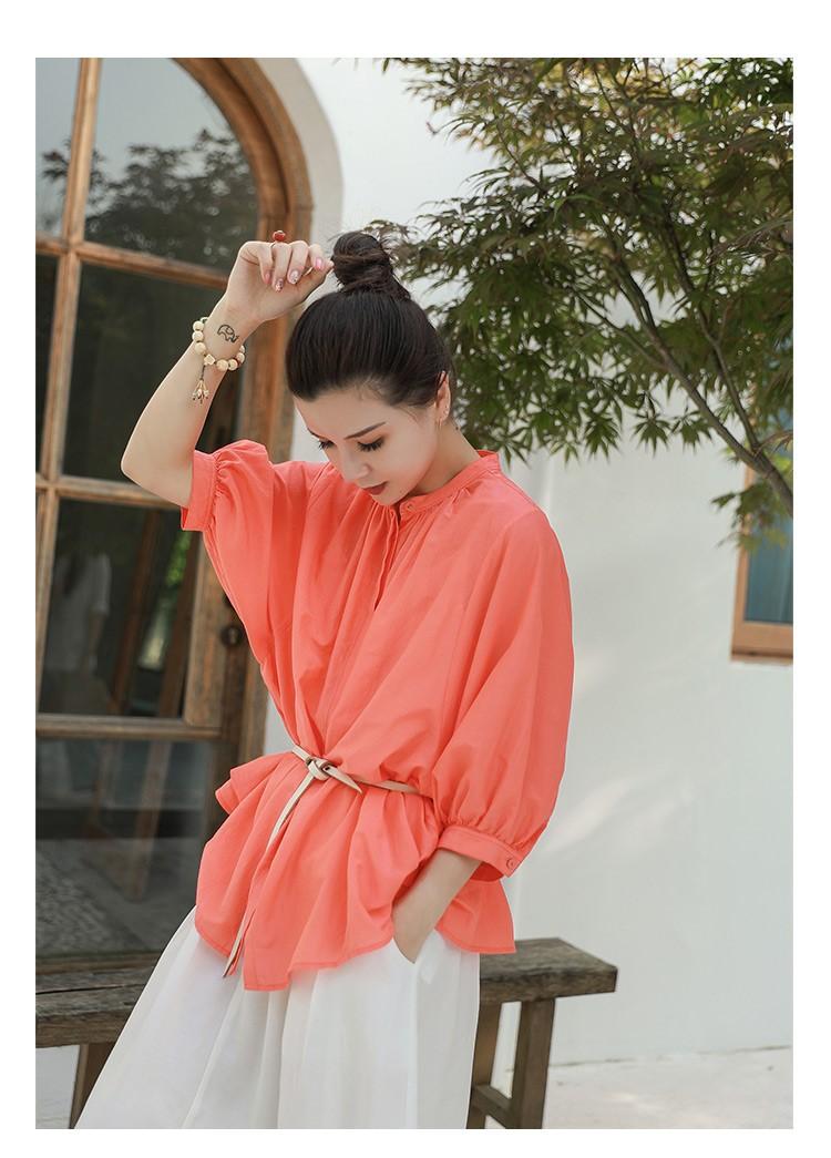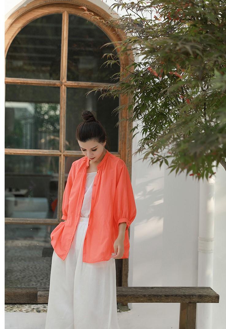 Classic Japanese three-quarter sleeves, small collar button design, and soft outline highlight the casual comfort. As for the color, I chose coral orange, which is popular this year, and can be paired with black pants, white pants, or skirts.