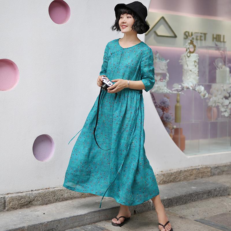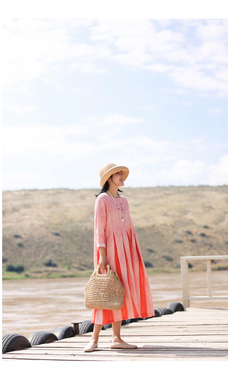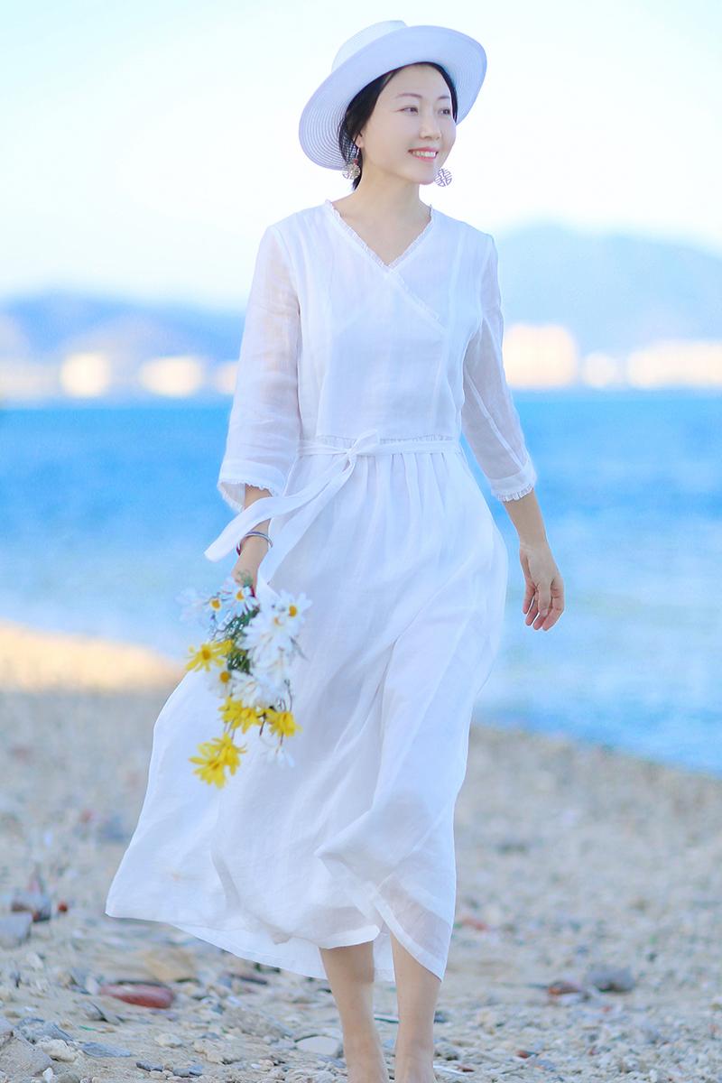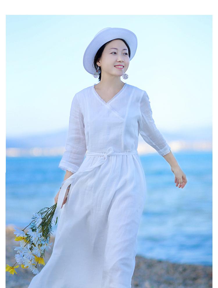 Elegance is its biggest feature. The oversized skirt has a sense of elegance, and the belt moves with the wind, making it look more fairy-like. Everyone knows that chun ramie fabric is light and breathable, which is very suitable for spring and summer wear. The thin three-quarter sleeves make the arms looming, and it is elegant and a little sexy.