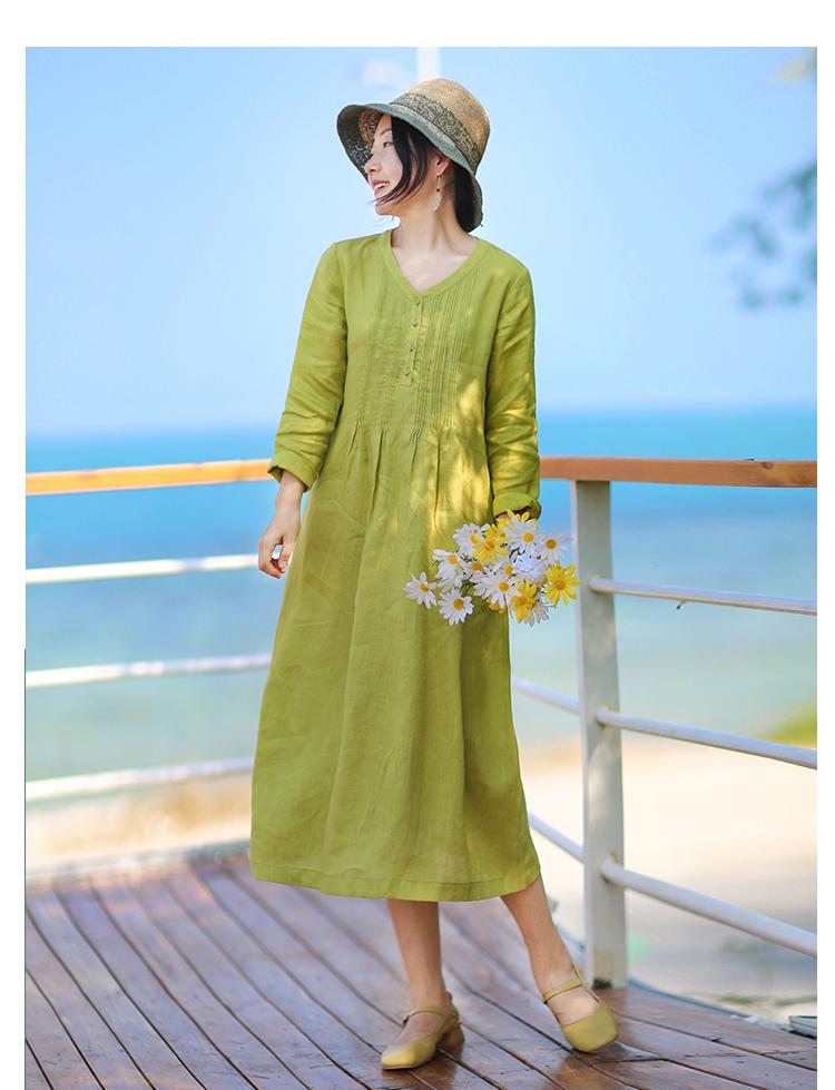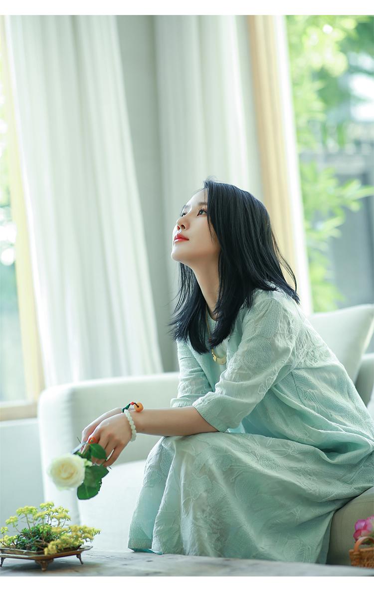 The refreshing apple green color makes people feel relaxed and happy at a glance. Just like Du Fu’s poem: The spring light is lazy and sleepy and relies on the breeze. Wearing it feels like a spring breeze, making people intoxicated in the lazy spring light. Made entirely of linen fabric, it is breathable and sweat-absorbent, and also whitens your skin tone. There is no doubt that flax is the king in spring and summer, and the hotter the weather, the more its benefits are revealed.