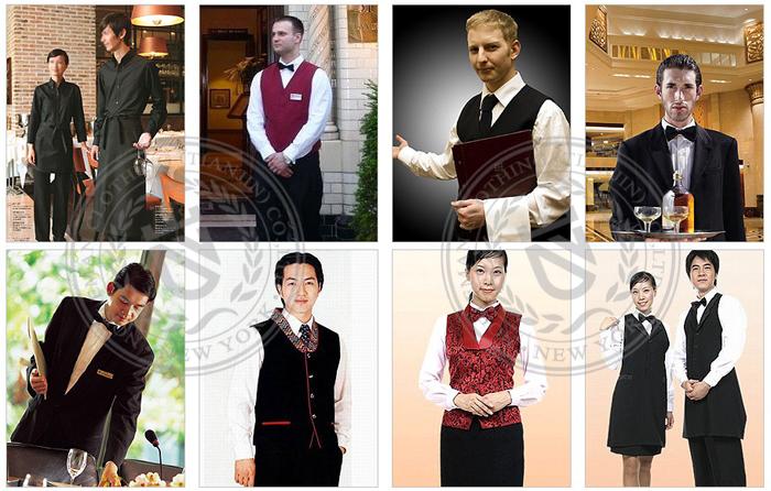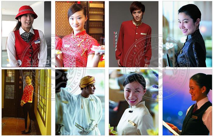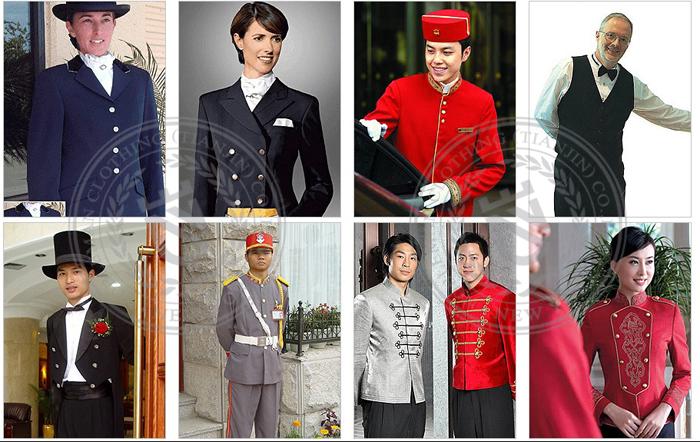 Types of Tianjin hotel uniforms: hotel manager uniforms, hotel doorman uniforms, hotel front desk uniforms, Chinese food waiters Uniforms, Chinese waiter uniforms, room service uniforms, cleaning staff uniforms, chef uniforms