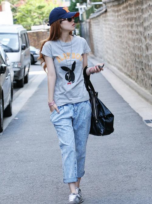 Gray T-shirt + blue jeans, roll up the trousers, casual! Printing makes the white T-shirt lively!…
