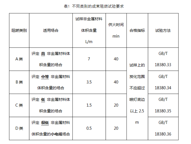 The GB/T 18380.33~36-2008 standard summarizes the provisions of each flame retardant category as follows: