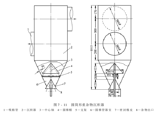 The cylindrical heavy debris depositor is shown in Figure 7-11. It is installed on the horizontal pipe section of the sub-cotton pipe and is mainly composed of a cylinder, an impurity discharge seal, etc.