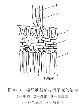Zi Mian The fixing power of fibers has a great relationship with the degree of dryness. The fiber strength and fixing power of moist cotton are higher than that of dry cotton. The fixing force of fibers on cotton seeds Figure 8-1 The structure of cotton fiber base and cotton seed shell is also related to its location. The fixing force of cotton seeds tips is greater than the fixing force of cotton seeds middle part. Therefore, the fibers at the tip are generally not easy to roll off. The blunt end (chaleal end) of cotton seeds has a thin shell, and the cohesion of cotton fibers is small. The fibers at the blunt end are easy to separate from the cotton seeds during ginning, but the shells are easily broken, resulting in cracks and fiber scraps.