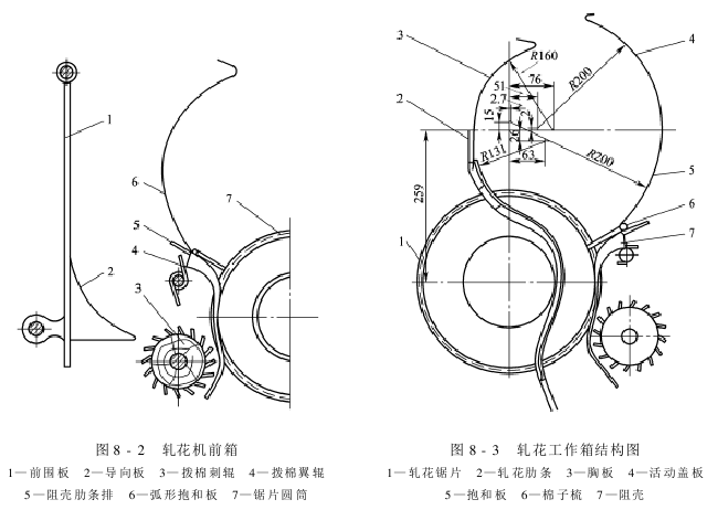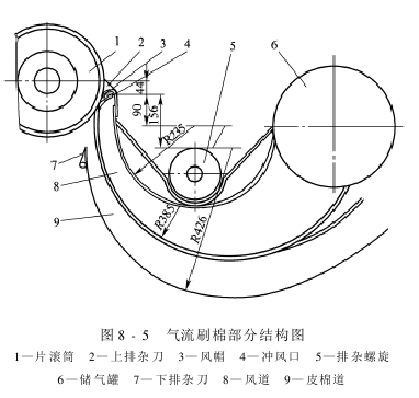 The brushing part of the brush-type sawtooth gin mainly consists of a brush roller, front and rear windshields, debris discharge adjustment plate, side windshields, debris shields, cover and bottom plate, as shown in Figure 8-4 Show. Brushing lint uses the wind generated by the high-speed rotating brush roller and the brush itself to separate lint and saw teeth.
